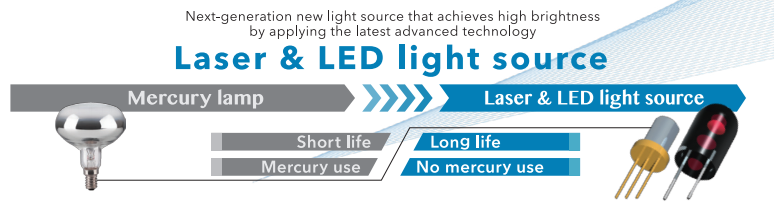 CASIO đã phát triển một công nghệ nguồn sáng bán dẫn mới kết hợp LED đỏ, phốt pho và ánh sáng laser màu lam. Nguồn sáng này đạt được cường độ sáng cao một cách an toàn nhờ sử dụng phốt pho để thay đổi bước sóng và pha của ánh sáng laser màu lam.- Chiếu sáng trạng thái rắn